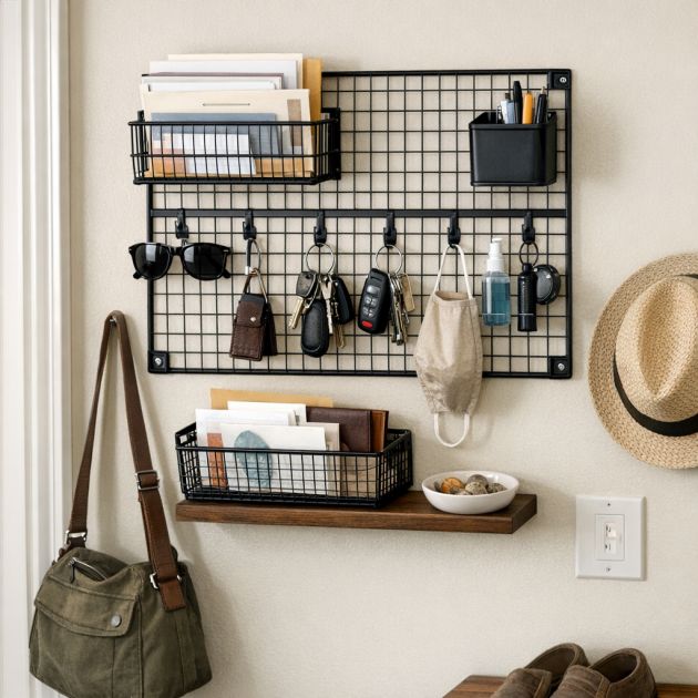 Transform an entryway into a functional command center using a cooling rack. Mount the rack near your door and add hooks to hold keys, sunglasses, and other grab-and-go essentials. This setup helps streamline your morning routine and ensures that you never misplace important items.