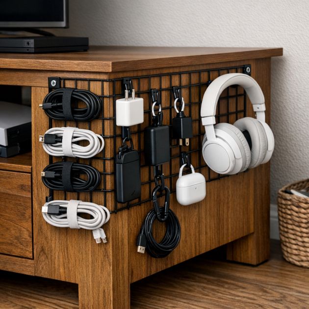 Cooling racks can help manage the tangle of cords and tech accessories that often clutter our spaces. Mount a rack to the side of a desk or entertainment center and use it to wrap cords neatly, keeping them off the floor and reducing tripping hazards.